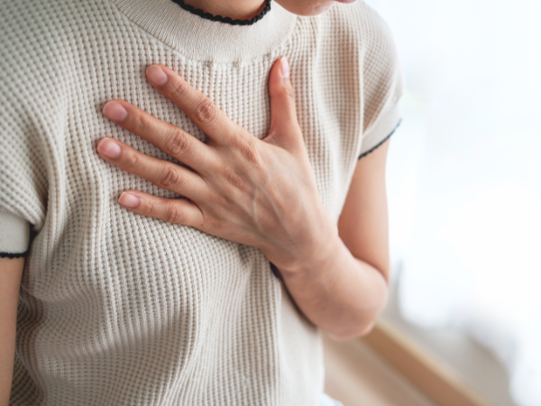 Sensação de aperto, pressão ou queimação no peito que pode irradiar para braços, costas, pescoço ou mandíbula. Merece atenção e avaliação cuidadosa.